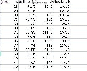 Size: 28, 29, 30, 31, 32, 33, 34, 35, 36, 37, 38, 39, 40, 41, 42